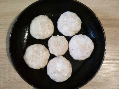 На сковороду налейте растительное масло. Разогрейте его. На масло выложите заготовки котлет, огонь убавьте до среднего, обжарьте котлеты с обеих сторон до румяной корочки.