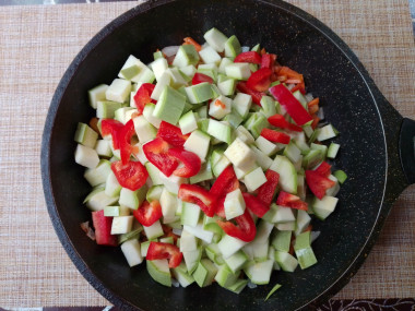 Далее добавьте на сковороду кабачок и болгарский перец.