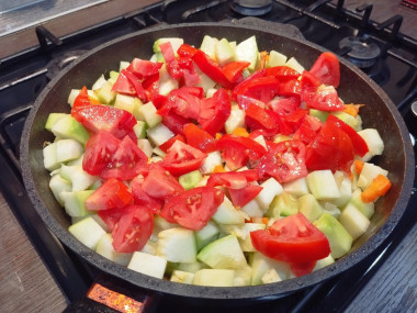 Следующим положите помидор, или помидорки черри, как у меня. Посолите и поперчите. Перемешайте. От воздействия соли кабачок быстро даст сок, поэтому нам не понадобится вода.