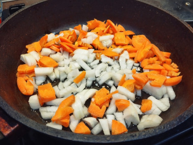 Сковороду поставьте на огонь, разогрейте на небольшом огне. Налейте в нее растительное масло. Первыми положите в сковородку лук с морковью. Обжарьте их в течении 5 минут, постоянно помешивая. Лук должен стать прозрачным, а морковь размягчиться.