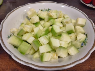 Кабачок у меня не молодой, поэтому сняла с него кожицу и убрала семечки.