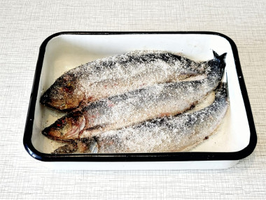 На дно контейнера из пищевого пластика или в стеклянную ёмкость насыпьте немного посолочной смеси, в один ряд выложите рыбу брюхом вверх, сверху высыпьте остатки смеси. Закройте ёмкость крышкой и оставьте при комнатной температуре на 10 часов, затем уберите в холодильник ещё на 1 сутки.