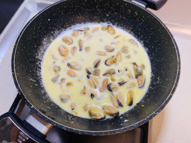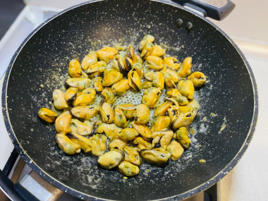 Еще один момент, мне кажется, что когда мидии обжарить, они приобретают более насыщенный вкус, поэтому их хорошо так поджарила и потом добавила вино, а дальше все как в рецепте.