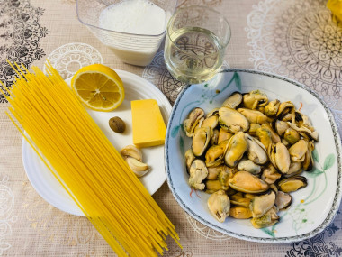 Как сделать пасту с мидиями в сливочно-чесночном соусе? Подготовьте необходимые ингредиенты. Мидии предварительно разморозьте на нижней полке холодильника, слейте воду. Мидии промойте и обсушите. Можете готовить пасту с мидиями в створках. Подробнее о том, как это сделать, вы можете почитать в конце рецепта.