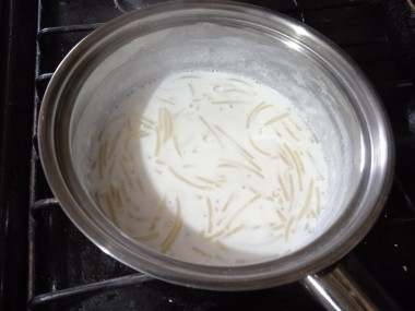 Когда молоко закипит, добавьте в него вермишель, постоянно мешая, чтобы она не слиплась в комок. Доведите все вместе до кипения и варите на небольшом огне, при постоянном помешивании пару минут.