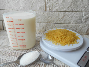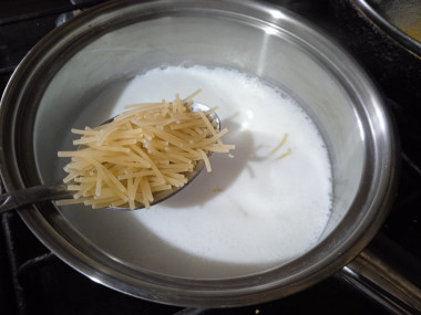 Пока молоко греется отмерьте необходимое количество вермишели. Имейте ввиду, что при варке вермишель набухнет и увеличится в объеме, поэтому если вы возьмете ее больше чем указано, то суп получится очень густым. По своему вкусу вы можете менять густоту супа. Все тонкости выбора и приготовления макаронных изделий вы узнаете из статьи в конце рецепта.