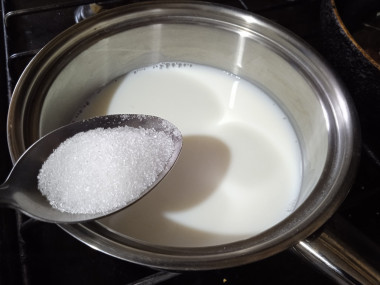 Добавьте щепотку соли и немного сахара. Размешайте и поставьте на огонь. Доведите молоко до кипения. Периодически помешивайте в процессе нагревания. чтобы молоко не подгорело.