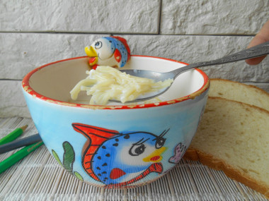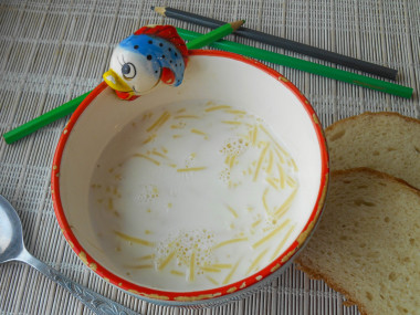 Сделала молочный суп с вермишелью для ребенка как в садике на завтрак. Сыночек сам попросил, уж больно он любит макаронные изделия. Готовила одну порцию, уменьшив количество ингредиентов в два раза с помощью калькулятора сайта, что очень удобно. Молоко довела до кипения. Добавила соль и сахар. Засыпала вермишель и варила на маленьком огне, помешивая, до готовности. Получился сладкий супчик средней густоты. Ребенок слопал всю тарелку и сказал "очень кусно!" Я пробовала, это и вправду вкусный детский суп. Он молочный, полезный, сытный и ароматный. Прекрасный рецепт! Большое спасибо автору 😊