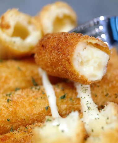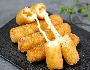 Очень интересный рецепт и в тоже время такой простой в приготовлении. Мне сразу захотелось приготовить и попробовать эти палочки. Все знают, насколько вкусно сочетание картофеля и сыра. До этого готовила просто сырные палочки в панировке, а вот картофельные ни разу. В качестве сыра использовала Моцареллу, люблю этот тянучий сыр. Обжаривала во фритюрнице, в большом количестве масла при температуре 170°C. Готовые палочки выкладывала на бумажные полотенца и сверху тоже промакнула полотенцем, не люблю много жира. Сверху немного посыпала сушеной зеленью. Палочки получились очень интересные, сверху хрустящая корочка, затем идёт мягкий картофель, а в центре плавленный сыр, который так классно тянется. Палочки очень вкусные, особенно горячие, остывшие палочки я разогревала в микроволновке. Отлично сочетаются с кетчупом. Закуска получилась что надо, действительно съедается очень быстро и хочется ещё.