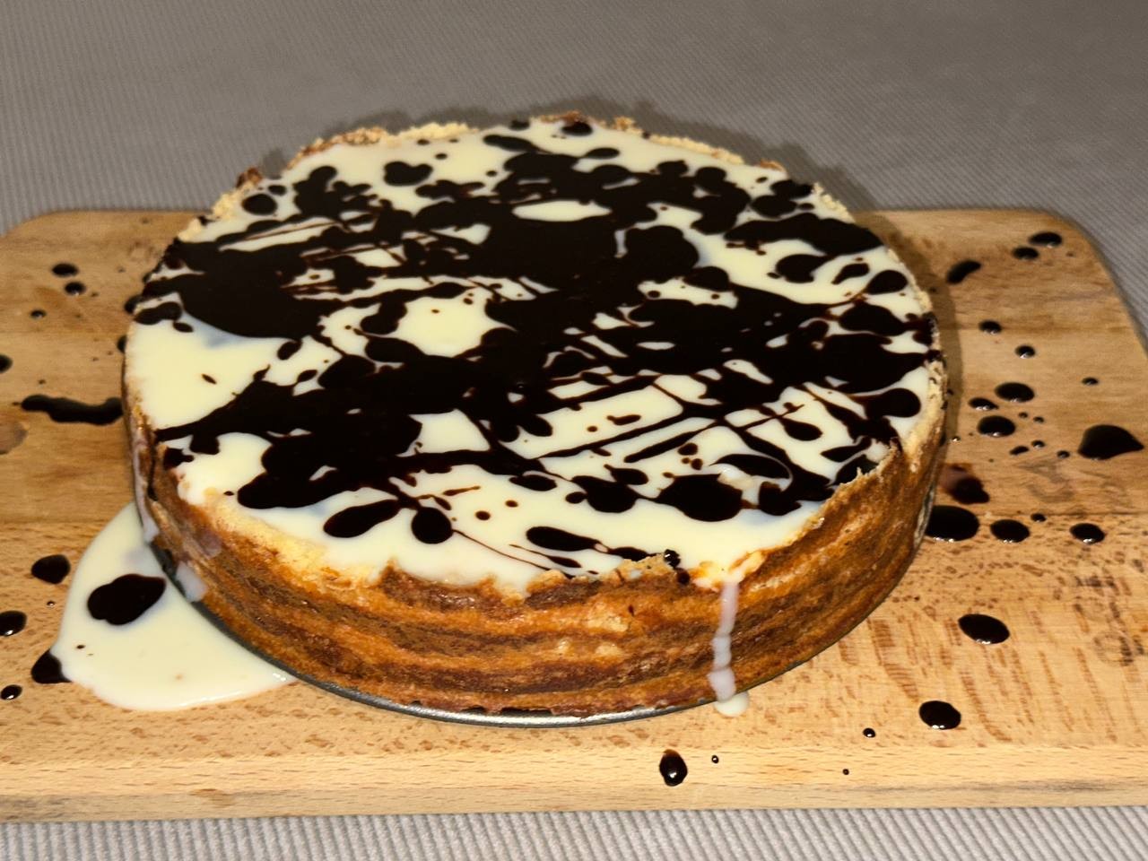 Ну просто чудо, как хороша эта ватрушка!!! Благодаря калькулятору рассчитала количество ингредиентов под свою форму 18 см. Необычно в данной ватрушке, что тесто вообще не нужно никак утрамбовывать, просто равномерно распределить. Выпекалось в газовой духовке без конвектора 50 минут, готовность проверила в середине шпажкой. В нескольких местах получились пузырики, я их прижала и поверхность стала ровной. Сметана оказалась только 20%, и заливка немного потекла, но за ночь стабилизировалась. Нанести глазурь получилось из разряда "я художник - я так вижу"