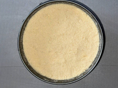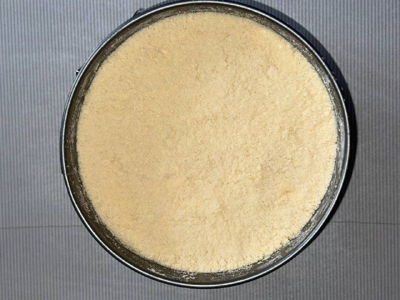 Форму для запекания смажьте сливочным маслом и присыпьте мукой. Я вместо этого вырезала из пергамента дно и ручки, чтобы ватрушку было легко вынимать из формы. Равномерно распределите по форме ¼ часть крошки мучной крошки.Шаг 8:
