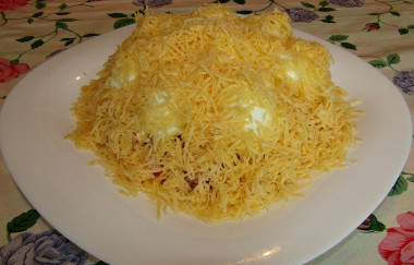 И посыпьте салат обильно тертым сыром. В готовом виде салат Сугроб смотрится очень эффектно и на самом деле похож на снежные сугробы.