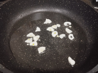 На сковороду налейте пару столовых ложек оливкового масла, хорошо разогрейте его на среднем огне. Выложите в масло слайсы чеснока, дайте ему подрумяниться, чтобы чеснок отдал весь аромат и вкус маслу. Затем уберите кусочки чеснока со сковороды. В чесночное масло выложите отваренную фасоль. Жарьте фасоль на умеренном огне 2-3 минуты, помешивая ее лопаткой, не накрывая сковороду крышкой.