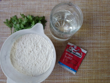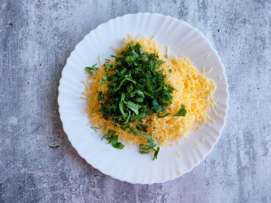 Свежую зелень помойте, просушите и мелко нарубите. Можно использовать только зелень укропа или смесь из укропа, петрушки и кинзы, либо вообще не добавлять зелень, но она придает особый вкус лепешкам. Смешайте сыр с зеленью. Начинка готова.