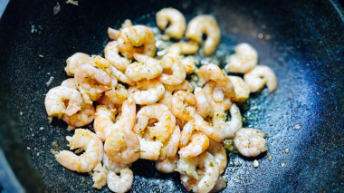 Далее отправьте в сковороду перец горошком, перец чили, соль и сухой розмарин. Перец и розмарин придадут особую изюминку и вкус готовому продукту. Сколько жарить креветки на сковороде? Готовьте креветки около 1-2 минут, постоянно помешивая.