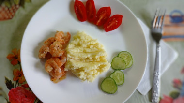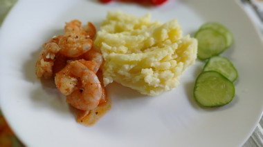 Креветки получились просто потрясающие! Ужин вышел на славу. Креветки я подавала с картофельным пюре. Как будто не дома поели, а в ресторане.