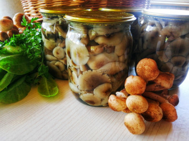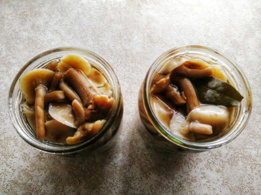 В стерилизованные баночки разложите опята с маринадом. Постарайтесь налить маринад так, чтобы он доходил по самое горлышко каждой банки. Так в банках не останется лишнего воздуха.