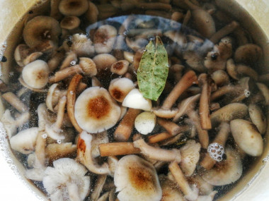 В кипящий маринад отправьте опята и варите всё вместе около 15 минут, убавив огонь до среднего.