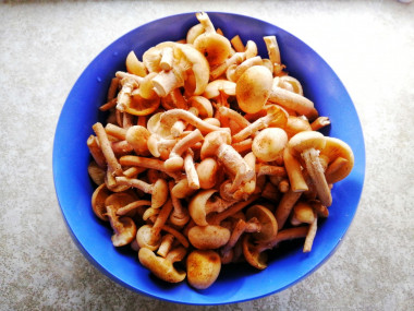 Для начала соберите в лесу опята. У меня были осенние. Отличительная их особенность чешуйчатая шляпка и юбочка на ножке. Если возможности сходить в лес нет, то можно использовать замороженные магазинные грибы.