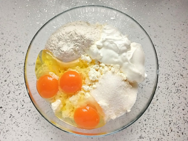 Очень вкусная, и легкий рецепт, 4 ст. Ложки муки, сметаны, сахара, и 3 пачки творога по 180г. спасибо! Готовлю постоянно, съедаем за 2 дня😁