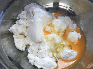Творог можно использовать с любым процентом жирности в зависимости от желаемой калорийности готового блюда. Для детей, конечно, нужно использовать жирный, натуральный и свежий продукт, для постящихся и худеющий можно взять обезжиренный творог. У меня был творог мягкий. Если творог зернистый и сухой, протрите его через сито или пробейте блендером. Добавьте сахар, щепотку соли, вбейте куриное яйцо.