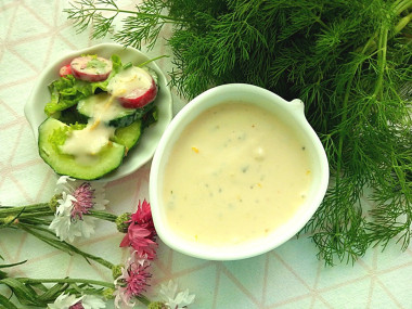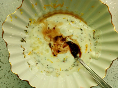 Оказывается так просто сделать йогуртовую заправку для салата! Всего то нужно смешать все ингредиенты, не нужно ничего варить и взбивать) Йогурт у меня домашний густой, как раз свежий сделала, его и использовала в качестве основы. Лимонной цедры взяла половину чайной ложки, мне кажется этого достаточно. Удивило наличие соевого соуса в составе, оказалось, что это просто замечательное сочетание! Такая вкусная заправка получилась, пряная, освежающая и при этом нежная и лёгкая. Я заправляла ею овощной салат с редиской и огурцами. Получилось замечательно, тем более что заправка вышла не густая и легко смешивалась с овощами.