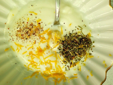 В миску выкладываем натальный йогурт, добавляем черный молотый перец, пропущенный через пресс чеснок и итальянские травы. По желанию, со специями можно поэкспериментировать, добавив в соус свои любимые приправы.