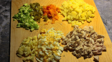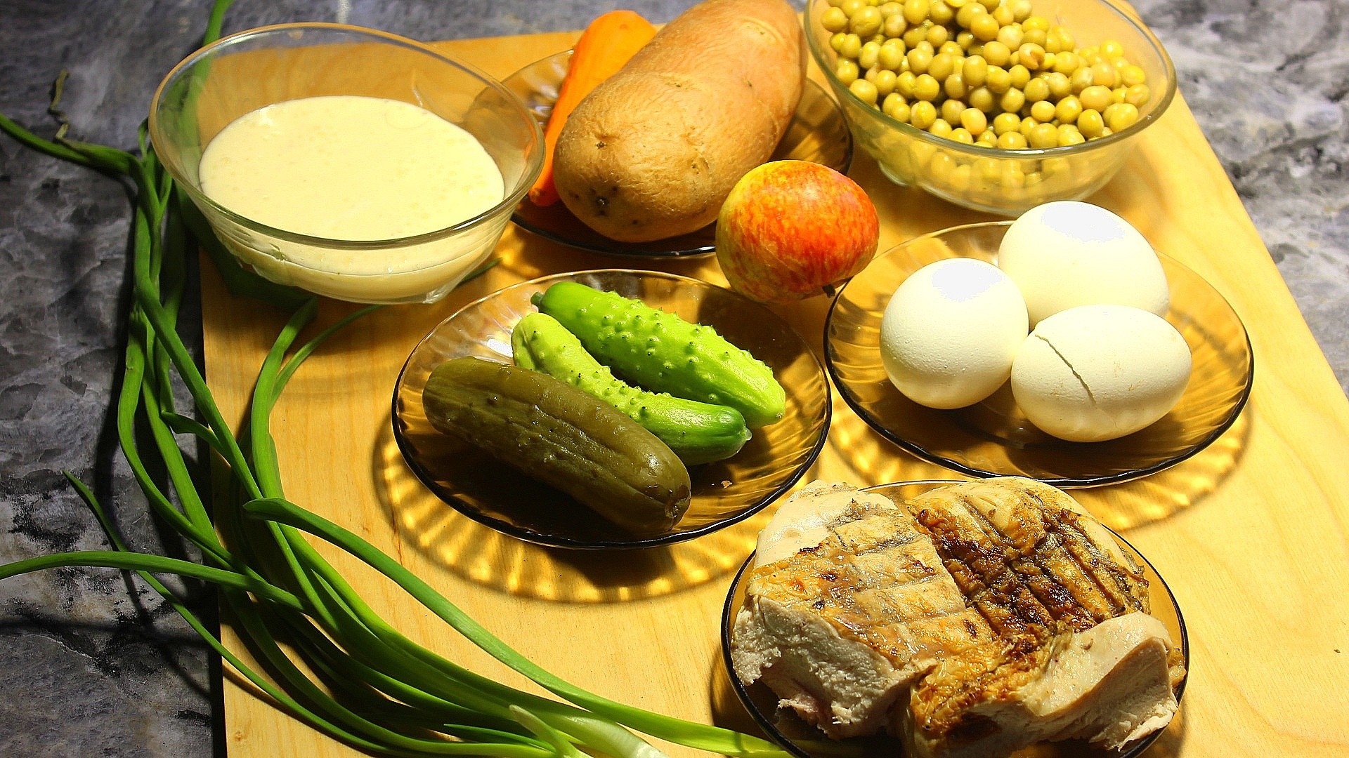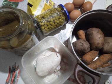 Приготовила на ужин салат оливье с курицей и огурцом. Из списка продуктов у меня не оказалось только зеленого горошка. Остальные были под рукой. Оставалось сварить мясо, картошку, морковь и яйца. Затем всё почистить и нарезать. Что я и сделала.