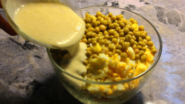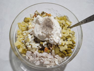 Также в качестве заправки можно использовать не только майонез, но и сметану или натуральный йогурт. Их можно взять по отдельности либо смешать с майонезом в любой пропорции на свой вкус - это снизит калорийность блюда.