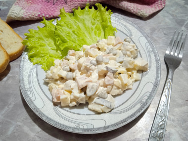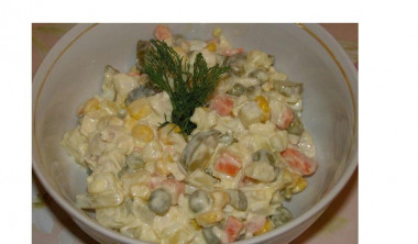 Все нарезанные ингредиенты заправьте майонезом и хорошо перемешайте. Салат готов! До застолья поставьте его в холодильник. Перед подачей выложите в салатник или же на порционную подачу. Готовый салат можно немного посыпать измельченным укропом. Приятного аппетита!