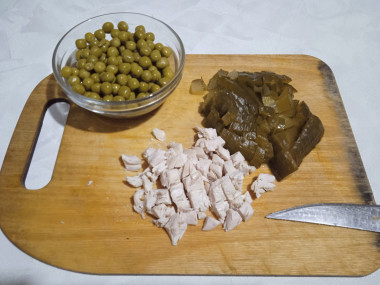 Нарежьте маринованные огурцы, так же, кубиками. Огурцы должны быть хрустящие и не сильно соленые.