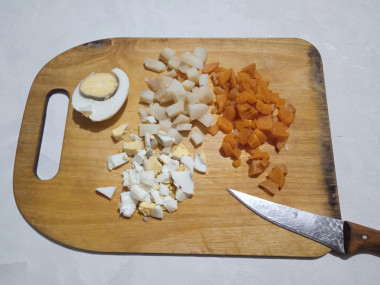 Подготовьте чашу для смешивания салата. Нарежьте куриное филе кубиками. Вареные яйца очистите от скорлупы, нарежьте и добавьте к нарезанному мясу.