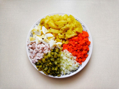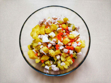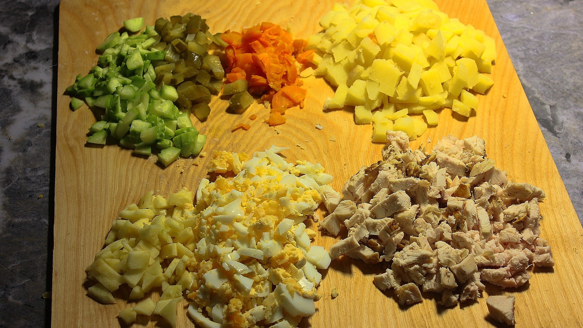 Салат будет красиво и аккуратно смотреться, если нарезать все ингредиенты одинаковыми по размеру и форме кусочками (например, кубиками).