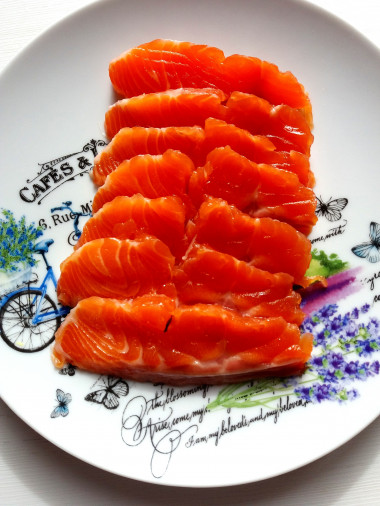 По случаю опять солила рыбу по этому рецепту, на этот раз у меня форель. Ну, что сказать вкусно - вкусно, ну очень вкусно!!! Первые три дня, каждый день, дегустировала по маленькому кусочку рыбу и наблюдала, как меняется структура мяса. На третий день, уже точно нет привкуса сырой рыбы, кусочки становятся плотные и уменьшаются в объеме. Самое время лакомиться рыбкой !