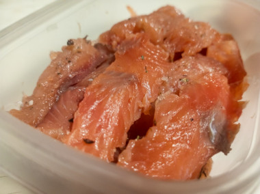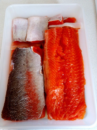 Понравилось также, что не надо проворачивать махинации с перекладываниями рыбы из соли в другой контейнер и следить чтобы не пересолилось. Абсолютно вся соль впитывается, никаких излишков.