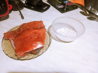 . Я купила радужную форель, разделала ее и решила посолить небольшую порцию, поскольку для меня это было впервые. Взяла всего 340 грамм рыбы. Как же удобно, что на сайте можно ввести количество порций с десятыми!!! Вбив в строку количество порций 4,6, я моментально получила расчет всех остальных ингредиентов. Так как для меня это был первый пробный заход в посолке рыбы, я решила использовать минимум специй – только крупную морскую соль и сахар. И не прогадала! За 3 дня форель стала малосольной, очень нежной и вкусной!
