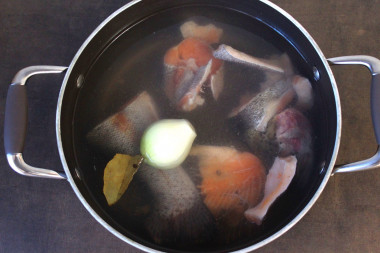 Рыбу вымойте, выпотрошите, если необходимо, снова вымойте. Налейте в кастрюлю подходящих размеров воду, выложите в нее голову форели и целую очищенную луковицу. Поставьте кастрюлю на средний огонь. Доведите до кипения и варите примерно 30 минут при слабом кипении. Снимайте пену. Точное время рассчитывайте по своей плите.