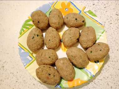 Мокрыми руками сформируйте из рыбного фарша котлеты. Можно котлеты обжаривать прямо так, можно обвалять перед жаркой в муке или панировочных сухарях. Я обваляла свои котлеты в панировочных сухарях.