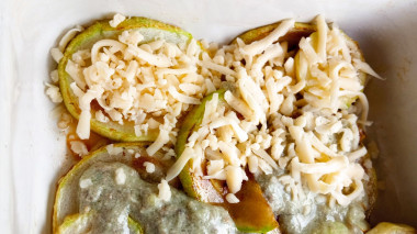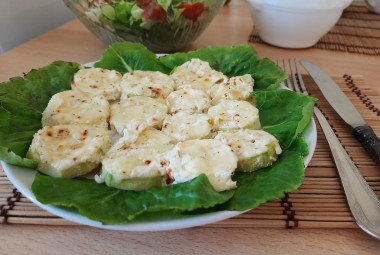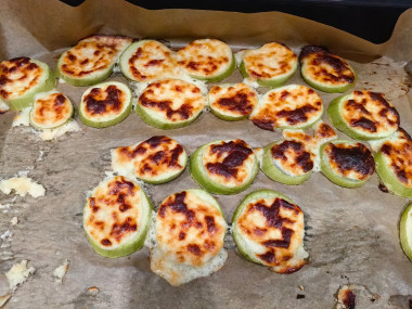 У меня был только тертый сыр а но и к лучшему сэкономила время, запекается быстро, лучший диет продукт а вообще кабачки можно и сырые есть) Добавила больше чеснока так острее) Благодарю