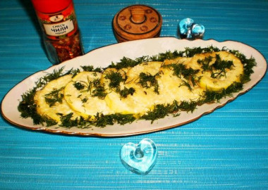 При приготовлении такого блюда можно перед запеканием посыпать кабачки нарезанной зеленью укропа, а можно это сделать уже после приготовления. Я сделала два варианта, и кабачок со свежей зеленью (не запечённой вместе с кабачком) мне показался ароматней и вкусней. Для первого варианта на этом шаге посыпьте измельчённой зеленью каждый кружок кабачка. Поставьте форму с кабачками в духовку, выпекайте примерно 20 - 25 минут.