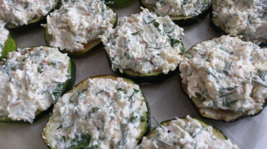 Кабачки перед запеканием, решила немного обжарить на сковороде. Вкус получается, более насыщеннее. Зелень укропа и петрушки, мелко измельчила и добавила в натёртый сыр. Сыр использовала колбасный. Затем добавила сметану и чеснок, выдавленный через пресс. На каждый кружочек кабачка, добавила сырную "шапочку" и поместила в духовку.