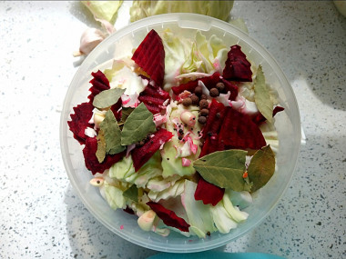 Возьмите подходящую по размеру кастрюлю или банку. Уложите в неё слоями капусту, свеклу, чеснок, добавьте лавровый лист и перец горошком. У меня вышло три слоя. Можно также добавить любимые специи и зелень.