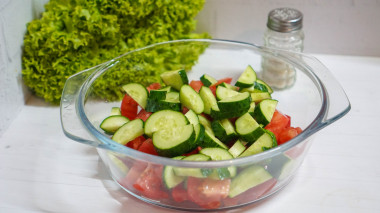 Полейте салат ароматной заправкой, перемешайте и сразу подавайте к столу. Салат из свежих овощей долго не хранится, они пустят сок и потеряют внешний вид и вкус.
