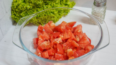 Помидоры помойте, обсушите и нарежьте дольками. Вы можете использовать любой вид нарезки, дольками или кубиками.