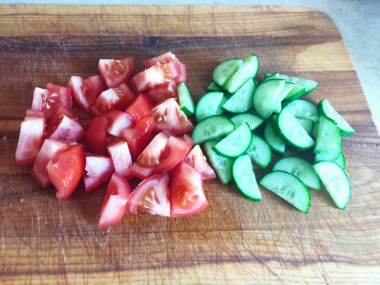 Огурцы также помойте, обсушите и нарежьте удобным для Вас способом. Обязательно попробуйте их на вкус — горький огурец испортит вкус всего блюда.