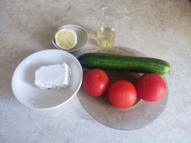 Как сделать салат с сыром фета и помидорами? Подготовьте продукты. Самый вкусный салат получится из сезонных овощей, в зимнее время лучше возьмите помидорки-черри, они вкуснее. Масло можете брать любое растительное, главное, чтобы оно было вкусным. Из половинки лимона понадобится сок, поэтому помойте его предварительно горячей водой. Или берите уже готовый лимонный сок.
