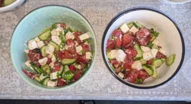 Данный рецепт скрасил меню в сезон помидоров и огурцов (когда классический вариант - помидоры, огурец, зелень и лук с оливковым маслом или сметаной надоели). Сначала переживала, как фета переживет перемешивание