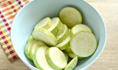 Овощи все помойте под проточной холодной водой и обсушите полотенцем. Если кабачки молодые, то шкурку с них срезать не надо, если шкурка очень твёрдая, то её лучше срезать и по необходимости убрать семена. Кабачки нарежьте кольцами толщиной 0,5 см. У перца срежьте плодоножку и извлеките семена, нарежьте кольцами. Если перец крупный, а кабачки маленькие, то перец можно порезать полукольцами. У помидора срежьте плодоножку и нарежьте кольцами.