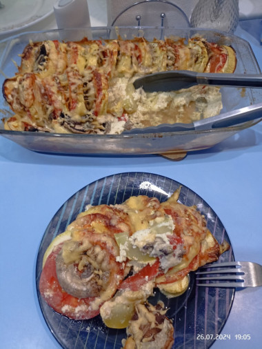 Это блюдо получилось очень лёгким, а если учесть, что и приготовление его не занимает много времени, то оно лёгкое вдвойне. Овощи получились сочными, ароматными, благодаря добавлению яично-молочной смеси и сыра, блюдо не пересушилось в духовке, а все полезные вещества овощей сохранились.