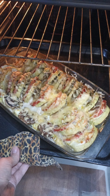 Сочно и вкусно, 😋 лучшее что я пробовала из запечённых кабачков. Перец муж забыл купить, заменила кружочками шампиньонов, так даже вкуснее 😋